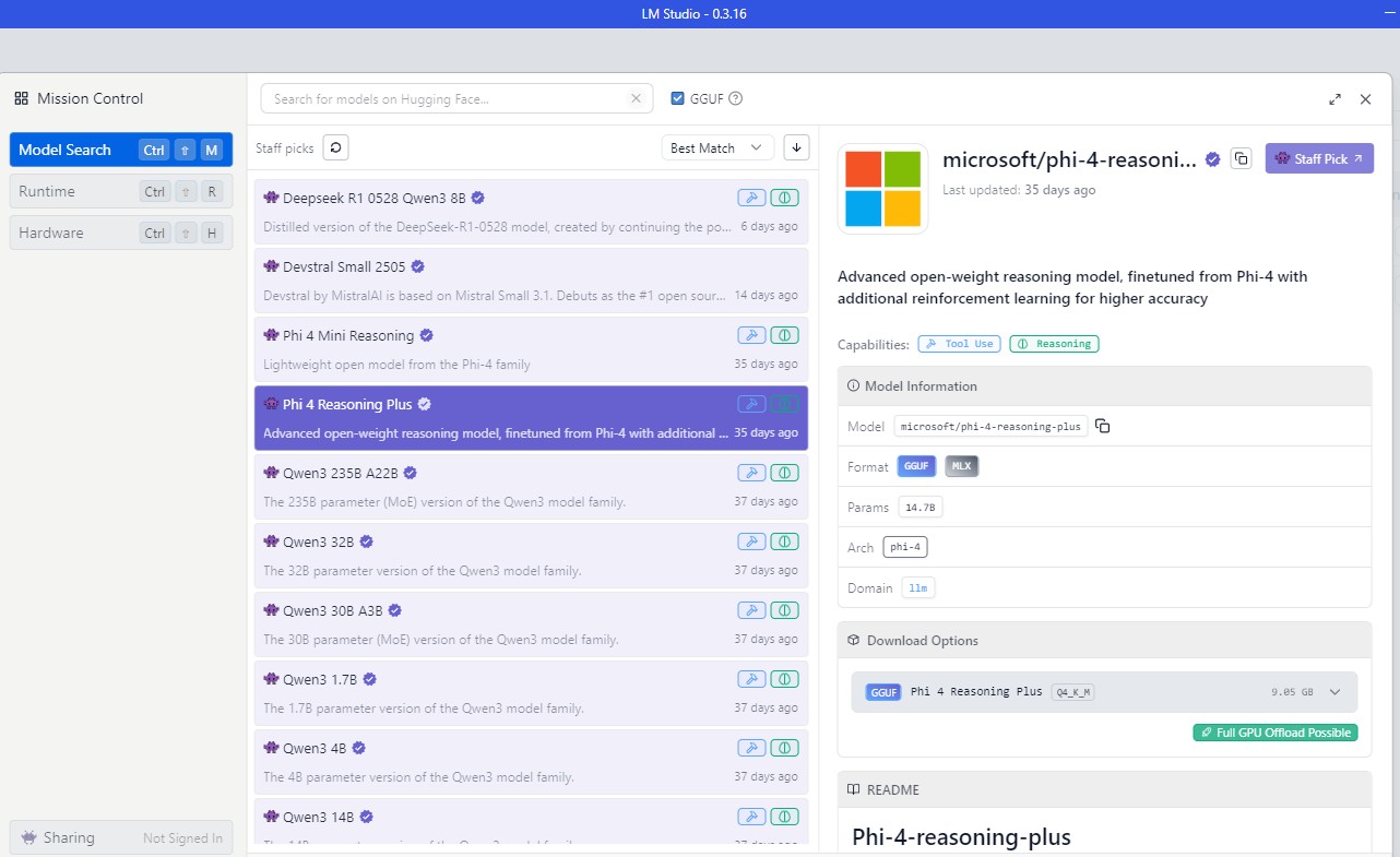 LM Studio is a downloadable desktop application that allows users to download, manage, and interact with SLMs. It offers the most user-friendly, graphically oriented environment. A familiar chatbox interface is easy for first-time users, who are uncomfortable with the command line (Figure 1). The application will automatically recommend SLMs for your hardware setup, including selecting an appropriate quantization and GGUF/MLX format, and download them without requiring manual searches through the Hugging Face repository (Figure 2). Multiple models can be stored locally to enable rapid switching between SLMs.