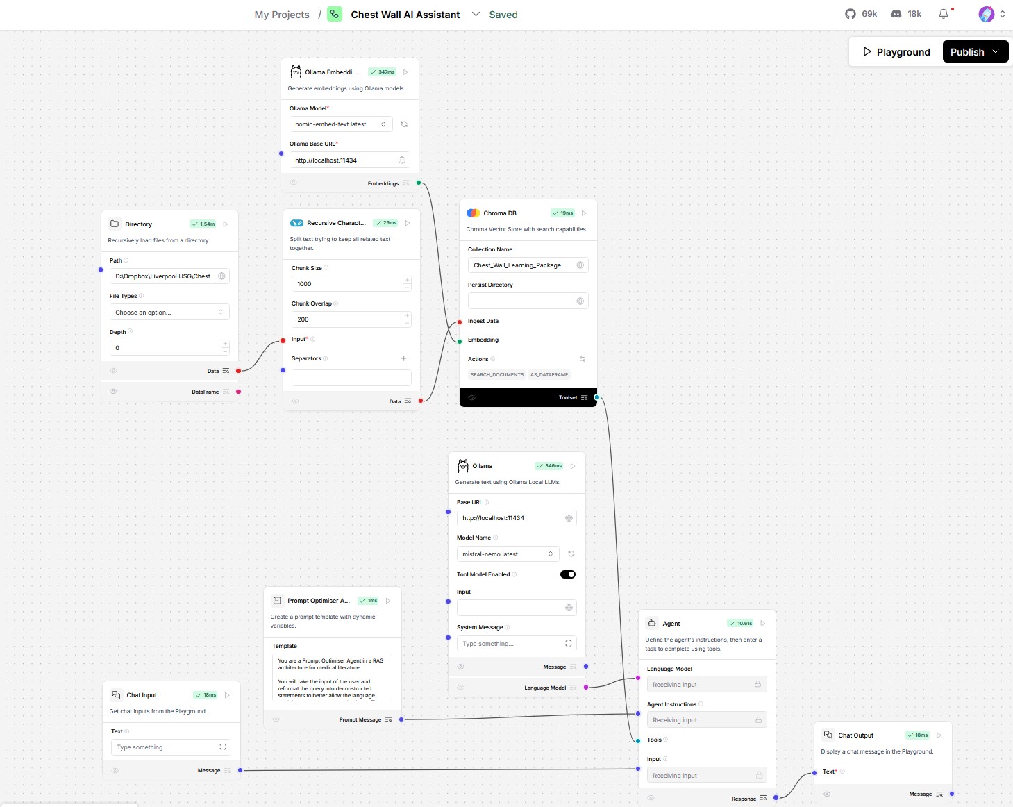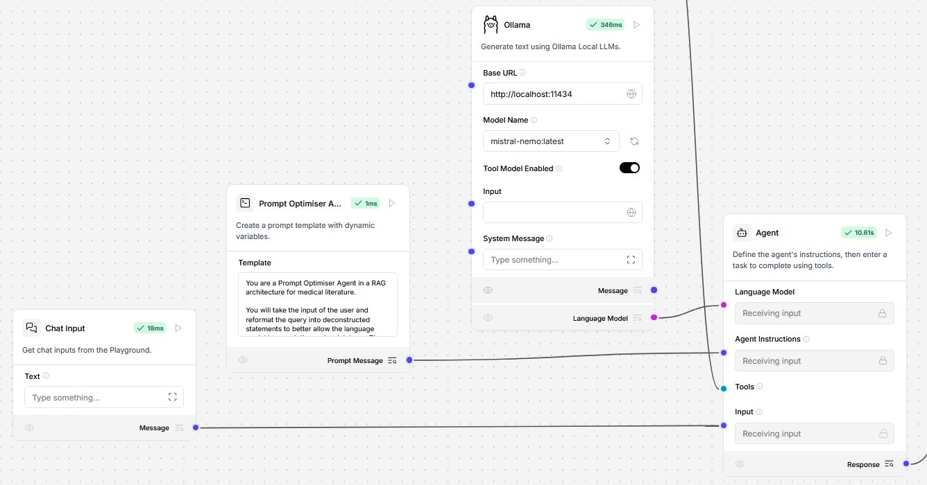 In Langflow, the underlying Python scripts are represented as graphical components linked via point-and-click data pipes. The necessary Python code is automatically generated without user intervention, thereby enabling the easy construction of agentic AI. Figure 7 is the Langflow workspace for the author’s personalized AI assistant connected to a RAG database of regional anesthesia. In the example shown, a prompt-optimizing AI agent takes the user’s initial question and transforms it into multiple, unambiguous, specific questions. The AI agent is powered by an SLM that can be executed in Ollama (Figure 8) or in LM Studio. This agent improves the overall system's quality by performing more precise queries on the RAG database.
