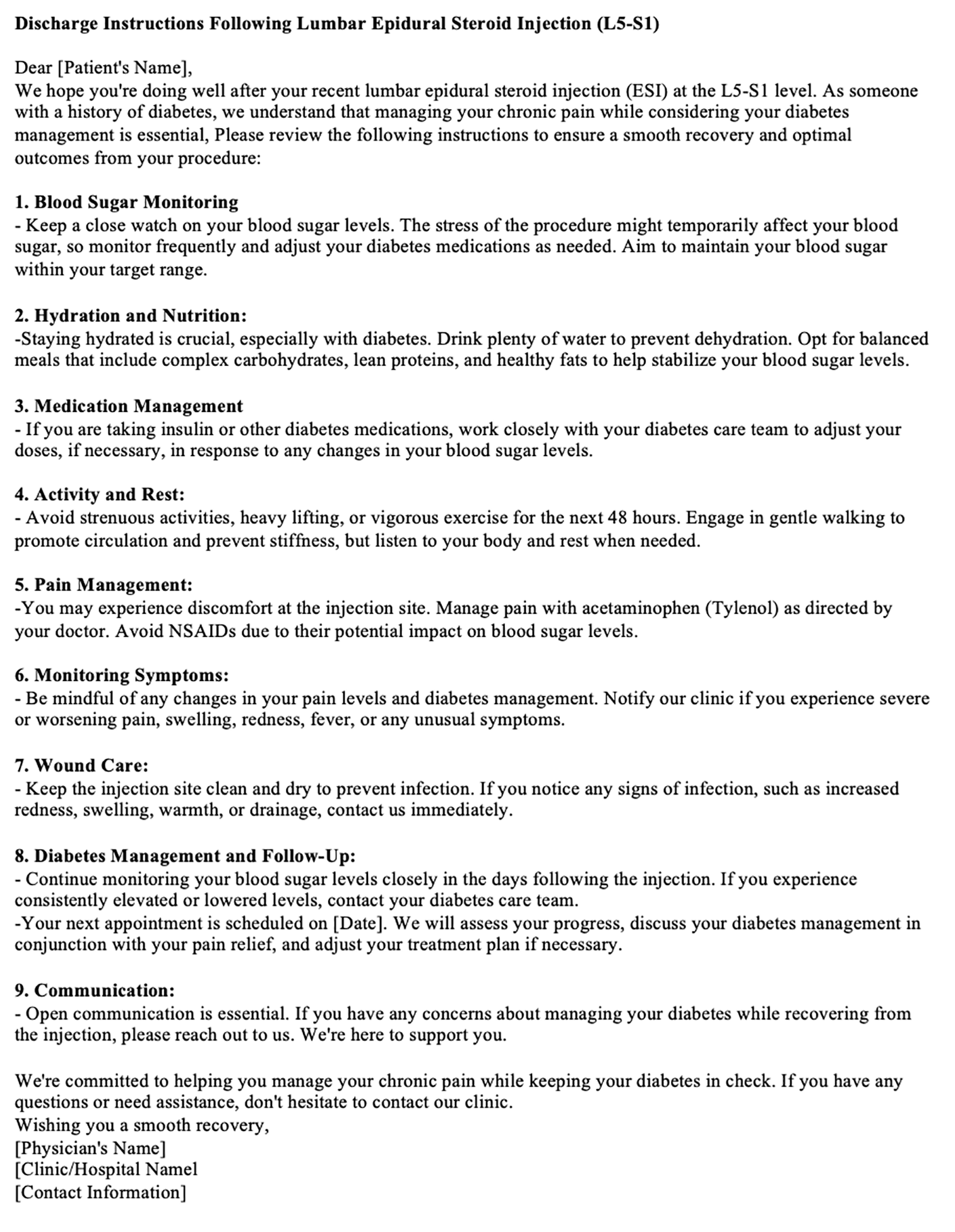 One example of a popular and publicly available LLM is Chat Generative Pre-trained Transformer 3.5 (ChatGPT-3.5) operated by OpenAI. To briefly examine the ability of AI to generate DI, we prompted this model to create DI tailored to the chronic pain patient population. We incorporated common comorbidities (eg, diabetes mellitus, hypertension), clinical events (eg, lumbar epidural steroid injection at L5-S1), and history of procedural complications (eg, post-dural puncture headache). To create each set of DI, we provided ChatGPT-3.5 with the following prompts: “Can you write discharge instructions for a patient seen in a chronic pain clinic who just had a lumbar epidural steroid injection at L5-S1, specifically for a patient with a history of [(A) diabetes mellitus, (B) hypertension, or (C) post-dural puncture headache]?” The output of the first prompt for diabetes mellitus is shown in Figure 1. These results were first reviewed and formatted by a board-certified pain medicine specialist.