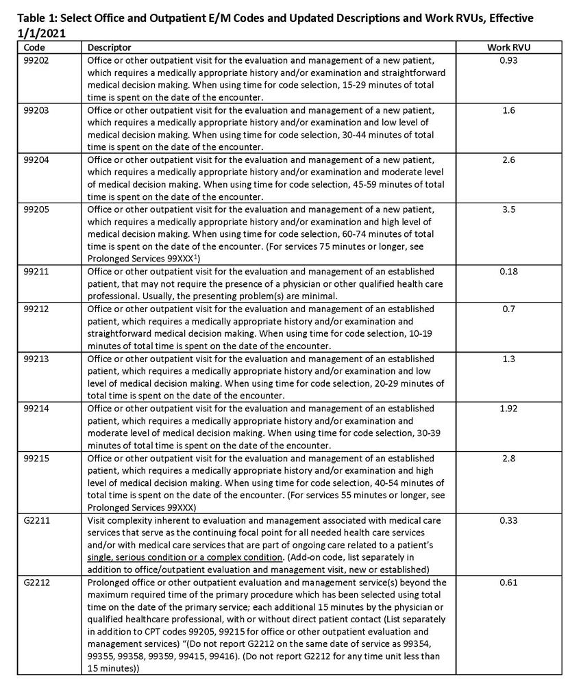 CMS largely adopted the CPT Editorial Panel’s recommendations for coding office and outpatient E/M visits, including eliminating coding for Level 1 new patient visits. Additionally, CMS finalized the addition of a separate add-on G-code to address complexity for certain types of E/M services that reflect ongoing, longitudinal care, that CMS does not believe is already captured in E/M code values (G2211).[1]  CMS provides additional detail on its expectations for use of G2211 in the preamble of the CY 2021 MPFS final rule.  Select office and outpatient codes for 2021 are included in Table 1 below, and a full discussion of the 2021 CPT recommended changes are included on the American Medical Association (AMA) website