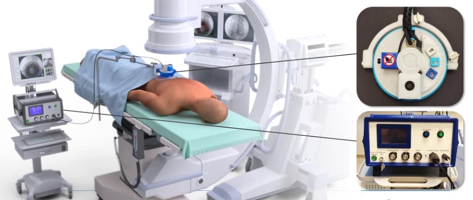 Low back pain is another common condition that is being investigated for the use of HIFU. (Figure 2) Common etiologies include facet arthropathy, sacroiliac joint dysfunction, and discogenic pain. Weeks et al. published a phase I observational study evaluating the efficacy and safety of MRgFUS in treating facet joint osteoarthritis. The 18 patients' studies found no adverse effects and a 45.8% improvement in Oswestry Disability Index.9 In clinical studies, the target for sonication is the posterior facet joint capsule.10 No human clinical trials currently exist on the efficacy and safety of HIFU for the treatment of discogenic back pain. However, Perrson et al. demonstrated that HIFU may be effective in producing localized heating and disc shrinkage.11 Initial experiments indicate that MRgFUS provides safe and effective ablation of the sacroiliac joint in sub-acute swine models and shows promise for human use.12 The use of fluoroscopy-guided HIFU for facetogenic pain and sacroiliac joint dysfunction is currently undergoing clinical trials. (Figures 2 and 3)