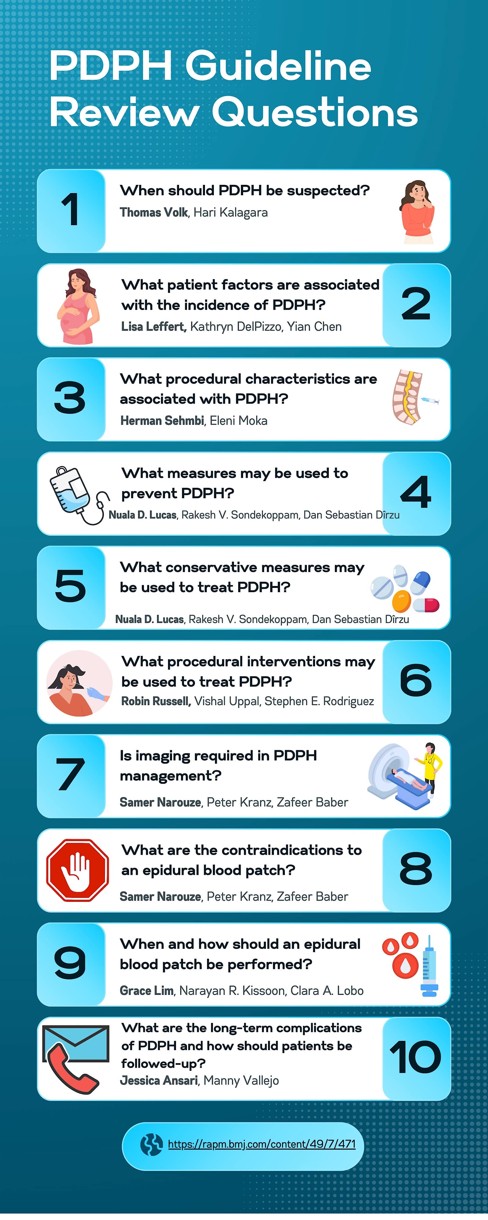 5. Uppal V et al. Evidence-based clinical practice guidelines on post-dural puncture headache: infographics. Reg Anesth Pain Med 2024;49(7): 502-4. https://doi.org/10.1136/rapm-2024-105280