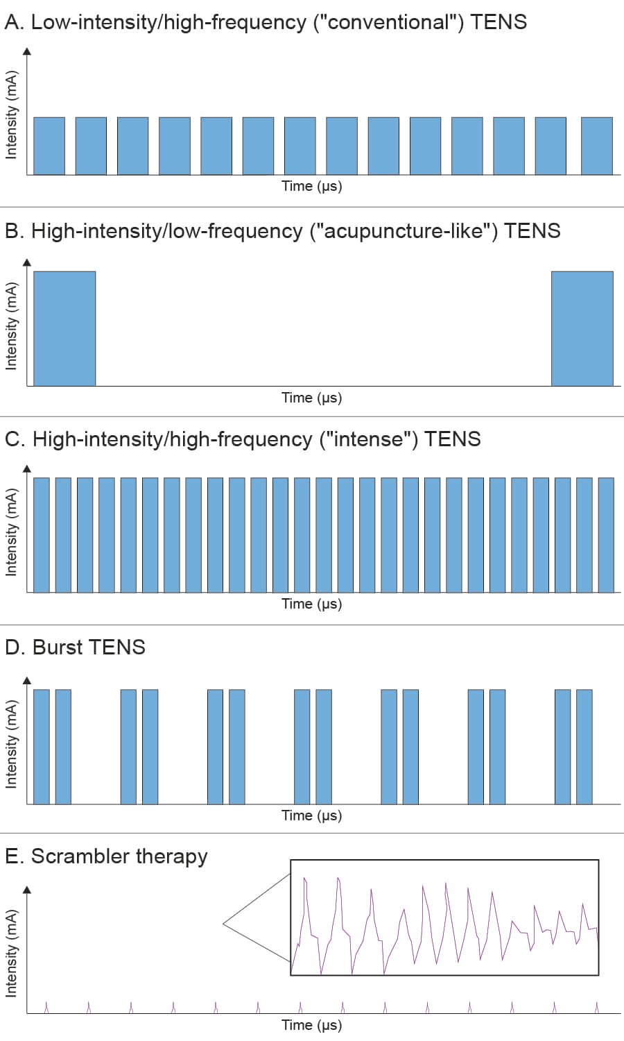 Figure 1. Common waveform patterns in transcutaneous electrical nerve stimulation (TENS) compared to Scrambler Therapy (ST).