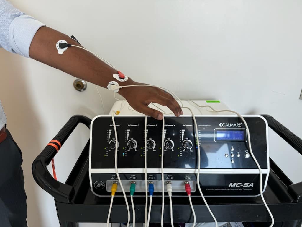 Figure 2. Scrambler therapy machine connected from the left forearm to the left wrist for complex regional pain syndrome.