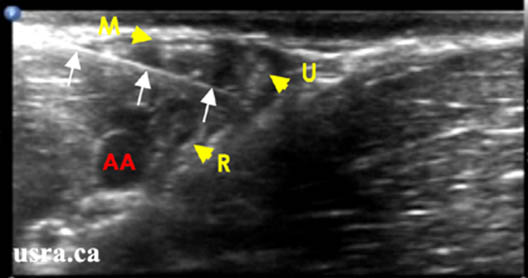 Figure 7. In-plane view of a needle positioned between the ulnar (U) and the radial (R) nerves. Note needle relationship to the median (M) nerve and the axillary artery (AA)